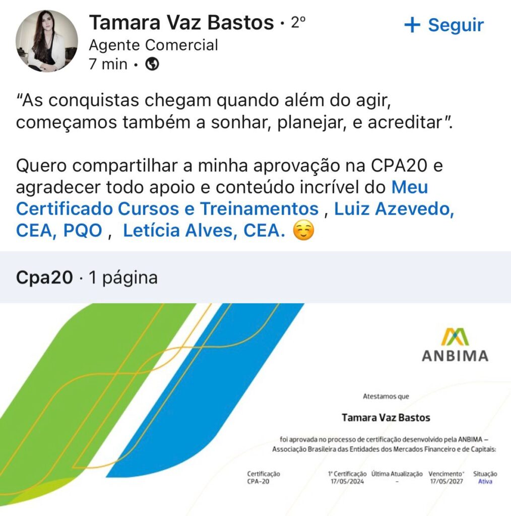 Com certificações como CEA, CPA-20, CPA-10, e PQO Operações, e sendo premiado tanto no Bradesco quanto no Íon Itaú, descobri minha verdadeira missão: orientar candidatos na preparação para provas da ANBIMA e na busca por oportunidades em bancos/cooperativas.